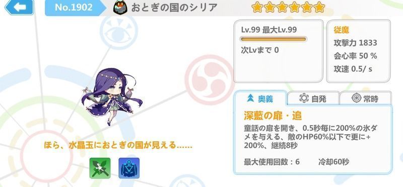 童話の扉を開き、0.5秒ごとに200%の氷ダメを与える、敵のHP60%以下で更に+200%、継続8秒