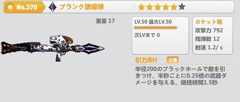 | ボスクエストでドロップするロケット砲。威力は低めだが着弾と同時にブラックホールが発生し敵を引き付ける。 プランクグレネードより狙った位置にBHを発生させられる点は優れており、盗賊娘の足止めに便利。 |