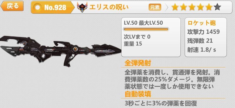 全弾薬を消費し、貫通弾を発射。消費弾薬数の25%ダメージ。無限弾薬状態では一度しか使用できない