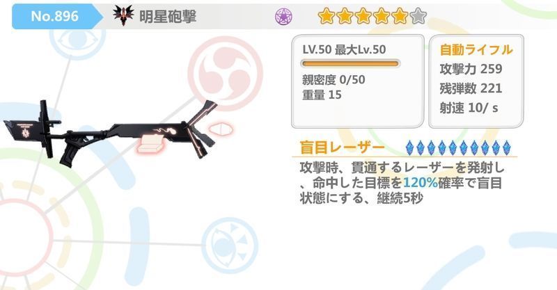 攻撃時、貫通するレーザーを発射し、命中した目標を80%確率で盲目状態にする、継続5秒