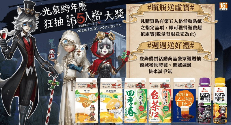 凡購買貼有《第五人格》活動貼紙的冷泡茶、茉莉茶園等指定品項,即可獲得第五人格超值虛寶!