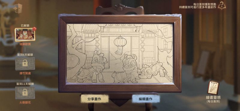 參與簽到可解鎖年畫創作,簽到越多可使用的畫板、角色貼紙越多。