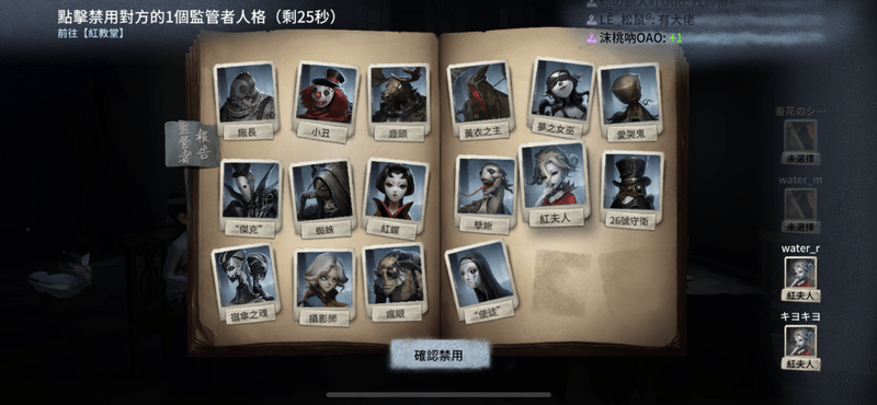 俗稱「小黑屋」,監管者陣營與求生者陣營可以各選擇禁止對方的角色。