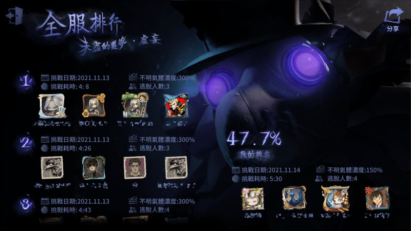 | 虛妄 | ‧需4人組隊挑戰 ‧3人以上逃脫即通關 ‧監管會使用窺探 ‧監管會使用噩兆 ‧監管會使用閃現 ‧監管會出去干擾,並用噩兆回來守屍 ‧地圖上會有“不明氣體”的毒圈 ‧地圖上會有造成“恐懼爆發”的爆炸圈 |