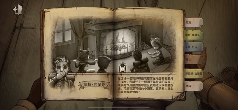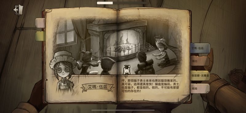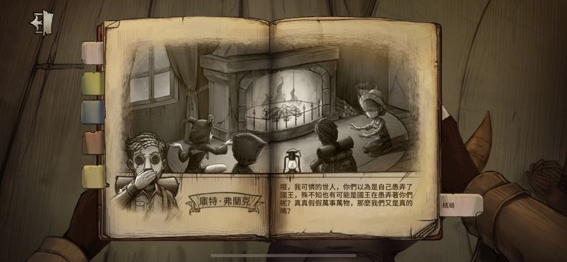 「他們本來是互相照顧,互相支撐著的,就像我以前那樣。但是後來有一個人腦子裡有了離開的想法,艾瑪原本就很討厭很討厭很討厭這樣的想法!」愛馬似乎是想到了什麼不愉快的回憶,怒火中燒,雙手也不自覺捏起了拳頭。「可是後來,艾瑪有一天也明白了,原來每個人都有想要逃離的地方,那是我的枷鎖。但是總會有一個人不願意放手,因為他那時候還沒有來得及明白。於是,有熊熊烈火,哦,真是太可怕了,它會帶走最愛的人,和生活下去的希望。我只能在餘灰中尋找殘留,然後,他把國王做成了項鍊,戴在脖子上,過上了他的生活,替代了他。嘻嘻,你們看,沒有人能夠真的衝破禁錮,嘻嘻。」艾瑪還在溫柔得撫摸著工具箱,那種神情若仔細看會十分眼熟,每一個孩子在哭泣得晚上,都是這麼被母親安撫的。