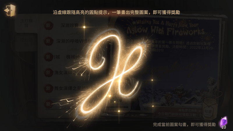 勾畫新年圖案來裝飾新年的第一張合照吧!透過對戰搜集煙花棒,勾畫圖案,可解鎖豐富獎勵。