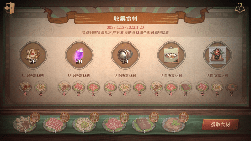 每次對戰可獲得隨機的2種食材,蒐集對應的食材可換得活動獎勵。也可將食材贈與好友,協助好友完成任務。(每日上線10個,活動上限90個)