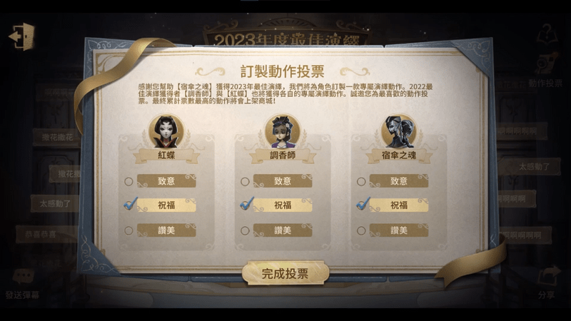 在評選中為獲得2023“最佳演繹”的稱號的角色送出寧芙卡的偵探們,可為其投票選出專屬演繹動作。該動作上架商城後,參與投票的偵探可獲得專屬折扣。