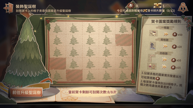 刮開賀卡上的格子來尋找隱藏的圖案並升級聖誕樹吧!