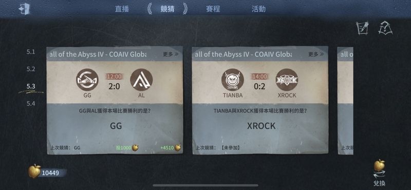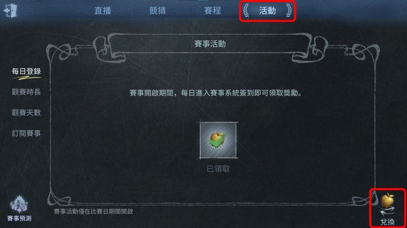 賽事期間,可以選擇以100金蘋果為單位下注賽事勝負,根據賠率有機會可獲得大量的金蘋果。
