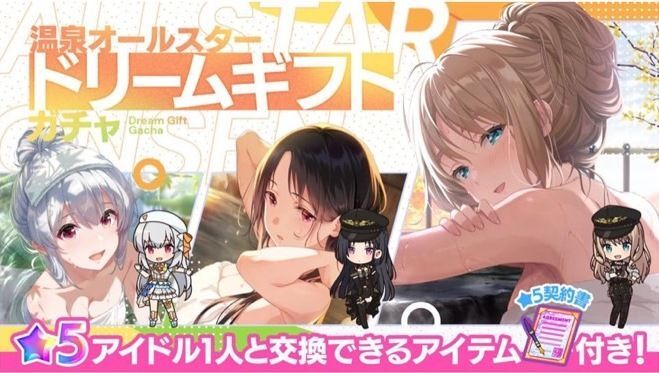 「温泉オールスタードリームギフトガチャ」は、ブルーダイヤを消費して1回限定で引くことができ、★5アイドルと交換できる「★5契約書」付きの10回ガチャです。