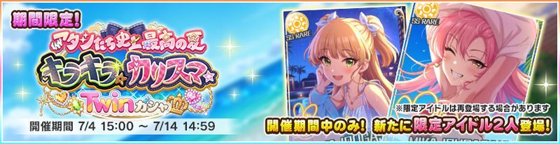 - 2025.07.04 ~ 2025.07.14 【期間限定】アタシたち史上最高の夏 キラキラ☆カリスマ★Twin ガシャ