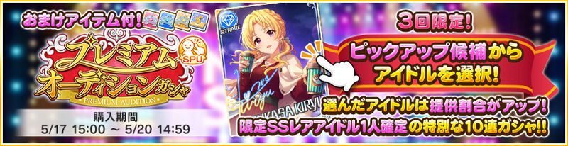- 2025.05.17 ~ 2025.05.20 プレミアムオーディションガシャ/リミテッドスキルピックガシャ