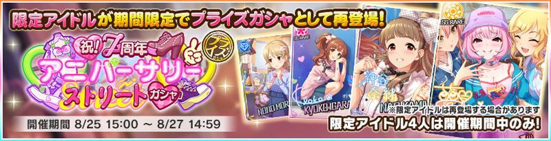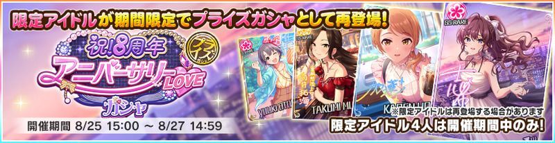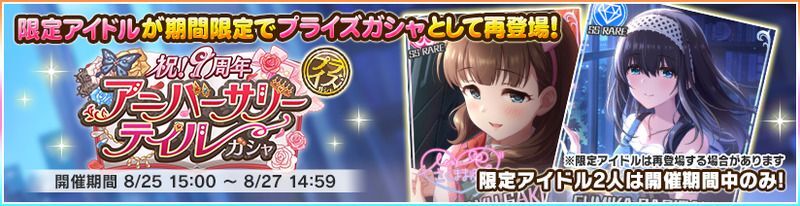- 2025.08.15 ~ 2025.08.18 プレミアムオーディションガシャ/リミテッドスキルピックガシャ