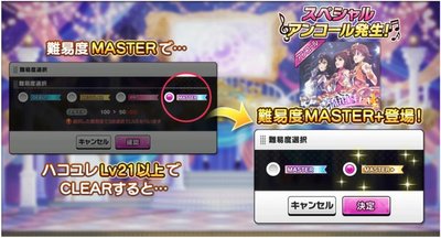 難易度がMASTERで、ハコユレLvが21以上の場合、アンコール楽曲の難易度で「MASTER+」が選択できます。