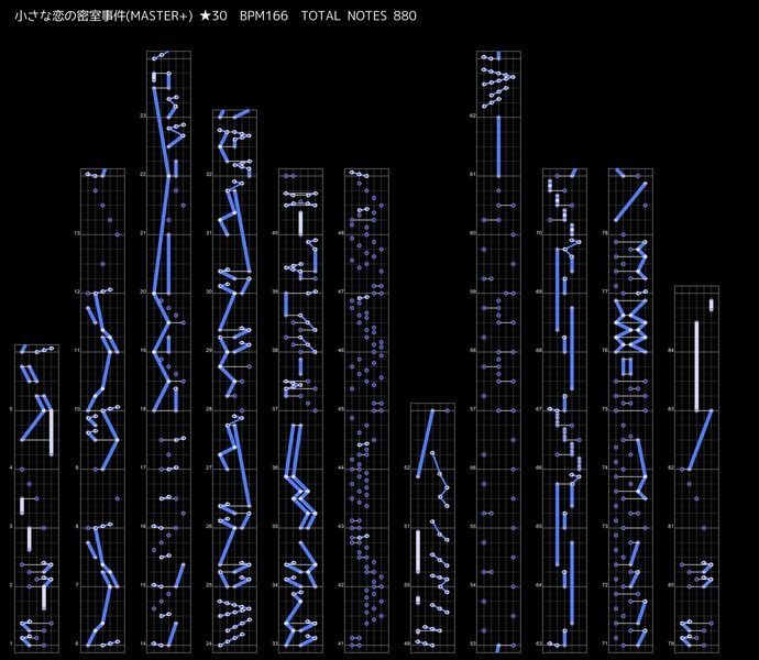 - 全体で見てもかなり少ない方であり、この曲よりもノーツ数が少ない曲は26のつぼみ、25のススメ☆オトメ ~jewel parade~を除けば全て難易度24以下である。
