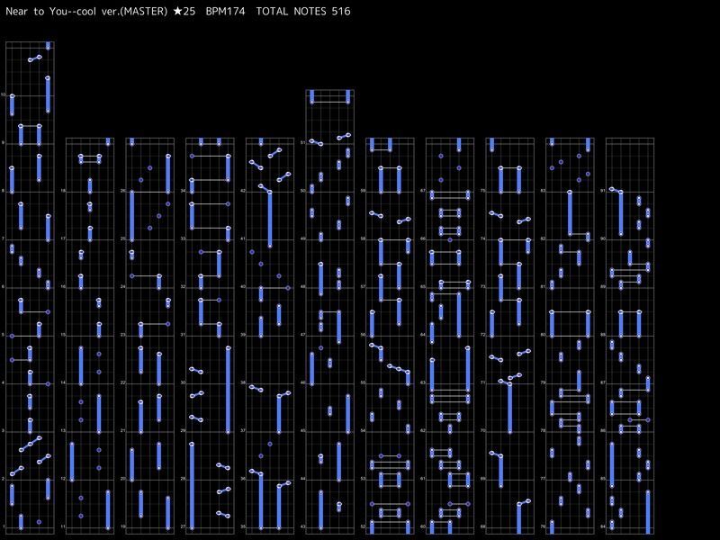 - ノーツ数516に対し、ロングノーツが205本(判定数410)なので、実に約80%がロングに充てられている。