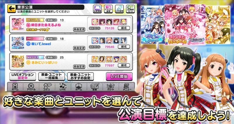 日替わりで切り替わる「流行曲」を含めて公演を行ったり、マニーを使用して「LIVEオプション」を設定すると、エリアの観客動員数がさらにアップします。