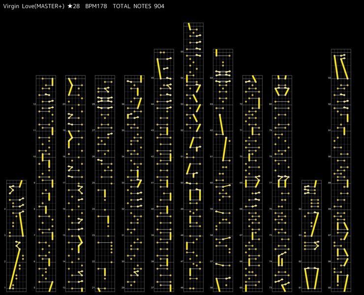 - ノーツ数480と楽曲Lv.18としては最多であり、MASTER入門並の量である。PROの中では現時点では3番目の多さとなっている。