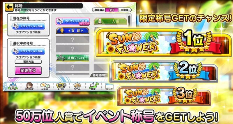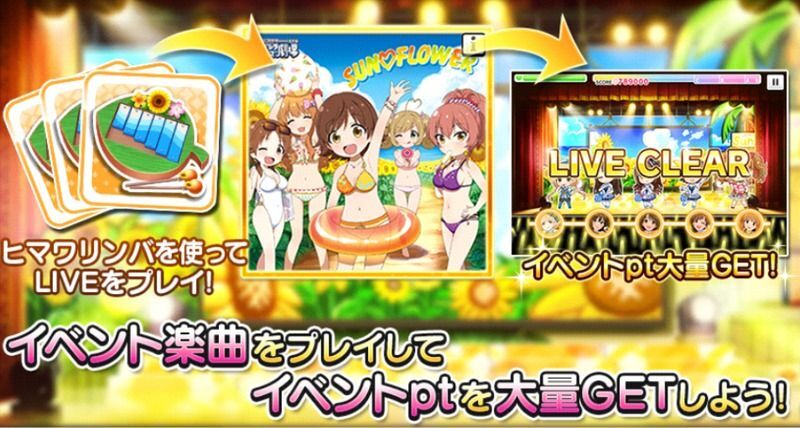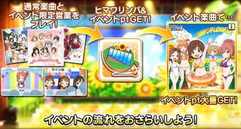 通常楽曲でヒマワリンバを集め、イベント楽曲で大量にptを獲得しましょう。ランキング入賞を目指して頑張りましょう。