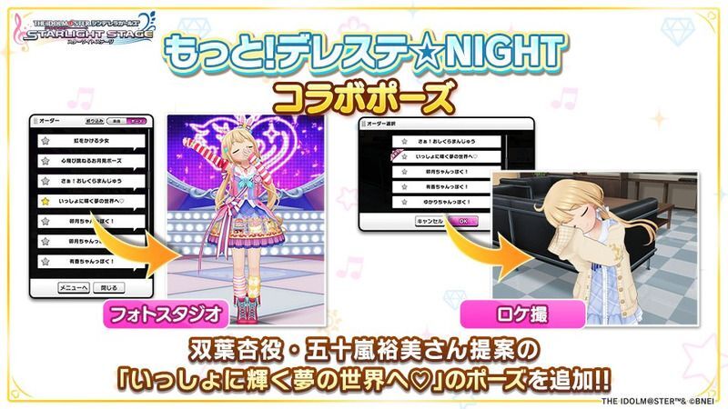 フォトスタジオは、自由にカメラを操作しながら、楽曲にあわせたダンスやポーズをアイドルに「オーダー」できる機能です。