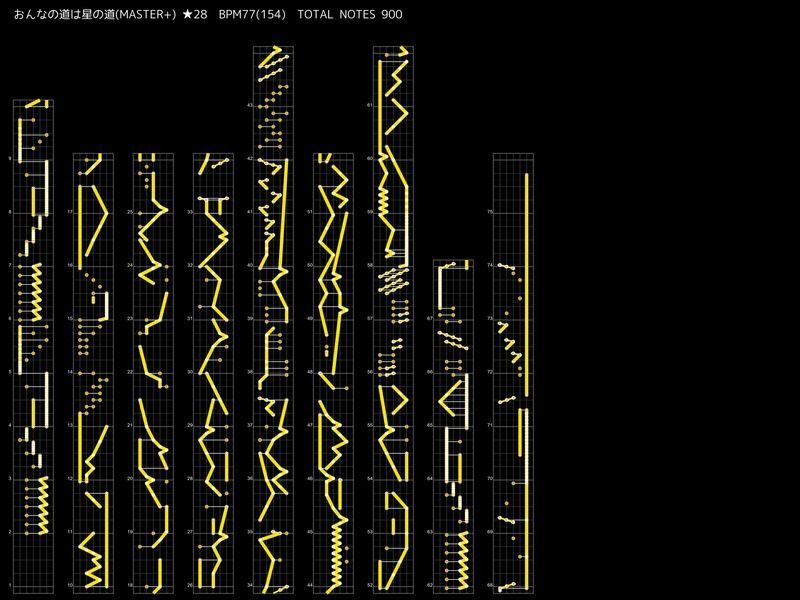 - ノーツ数は152とこの難易度帯としては少ないが、難易度詐称どころか、Lv.14強相当以上の内容が含まれている最大級の詐称曲。