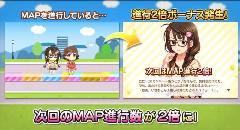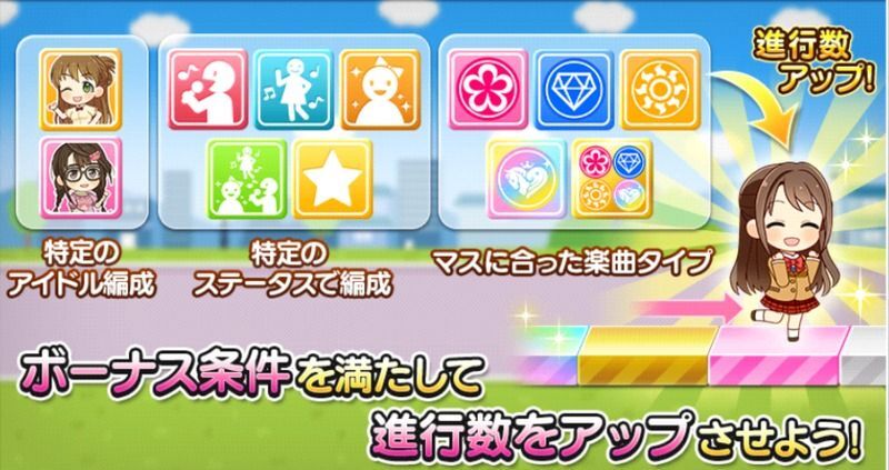 MAP進行ボーナスは、MAPにあわせたアイドルを編成したり、現在止まっているマスの色に応じた楽曲でLIVEを行うことで発生します。