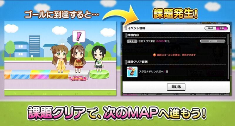 | MAP 1 | 10 | 合計スコア100,000以上 | スタミナドリンク20×1個 ルート新規開放「奥山沙織」ルート | スターランク |