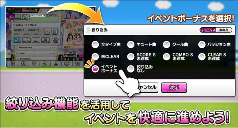 ボーナス条件はイベントTOPや楽曲の選択画面等で確認できます。