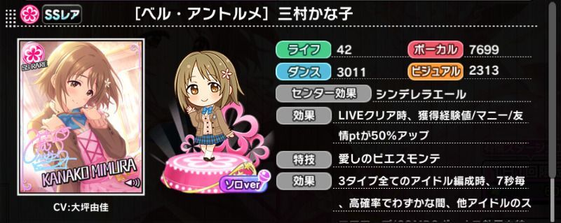 | 3タイプ全てのアイドル編成時、7秒毎、高確率でわずかな間、他アイドルのスコアアップ/COMBOボーナス効果を特大アップ、他特技効果を大アップ | |