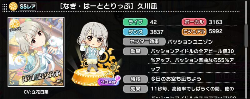 | 11秒毎、高確率でしばらくの間、他のパッションアイドルのスコアアップ/COMBOボーナス効果を特大アップ | |