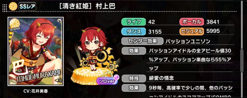 | 9秒毎、高確率で少しの間、他のパッションアイドルのスコアアップ/COMBOボーナス効果を特大アップ | |