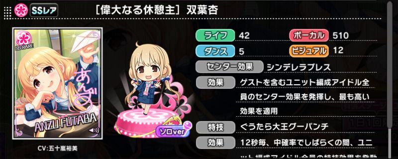 | 12秒毎、中確率でしばらくの間、ユニット編成アイドル全員の特技効果を発動し、最も高い効果を適用 | |