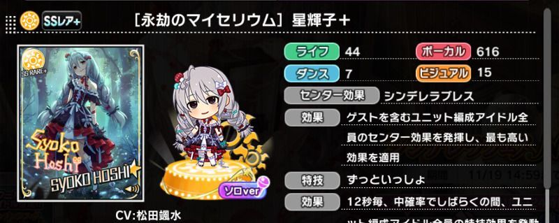 | 12秒毎、中確率でしばらくの間、ユニット編成アイドル全員の特技効果を発動し、最も高い効果を適用 | |