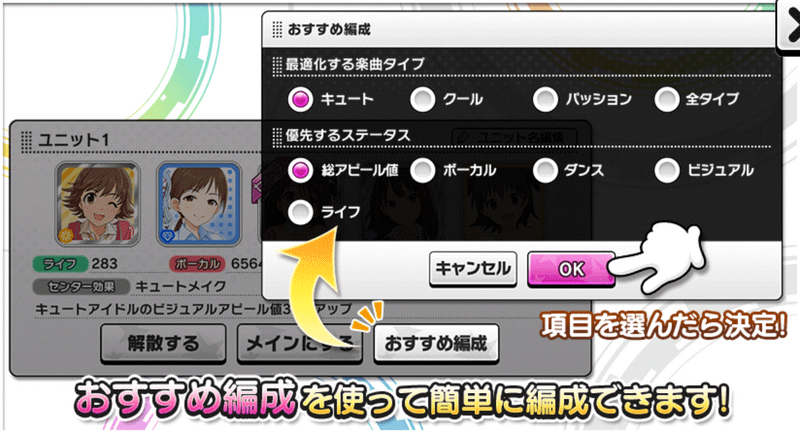 楽曲タイプや優先するステータスを設定して自動編成することができます。
