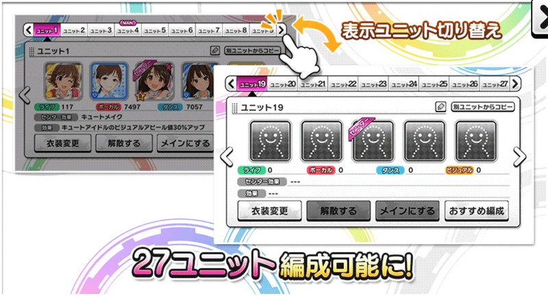 - ユニット内のアイドル同士を入れ替えることも可能です。