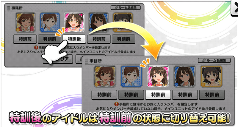 - 特訓前後のアイドルなど、イラストが異なるアイドルは重複して編成できます。