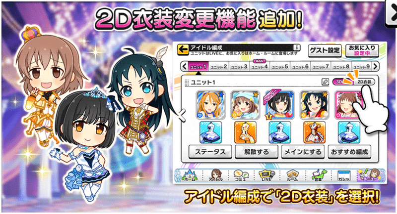2DLIVEとルームで登場するアイドルの衣装を、変更することができます。