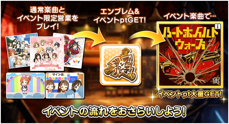 通常楽曲とイベント限定営業をプレイすると、ガンズパーティーエンブレムとイベントptを獲得できます。