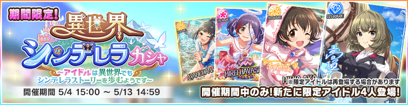 ※期間限定アイドルは、「異世界シンデレラガシャ ~アイドルは異世界でもシンデレラストーリーを歩むようです~」開催期間終了後、出現しなくなります。