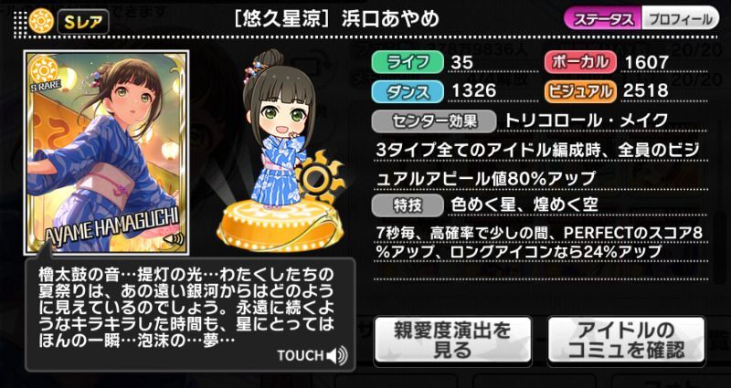 | 3タイプ全てのアイドル編成時、全員のビジュアルアピール値80%アップ | |