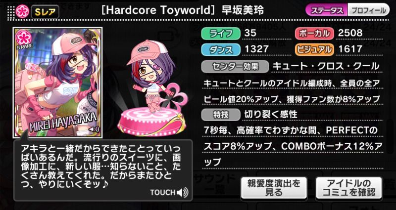 | キュートとクールのアイドル編成時、全員の全アピール値20%アップ、獲得ファン数が8%アップ | |