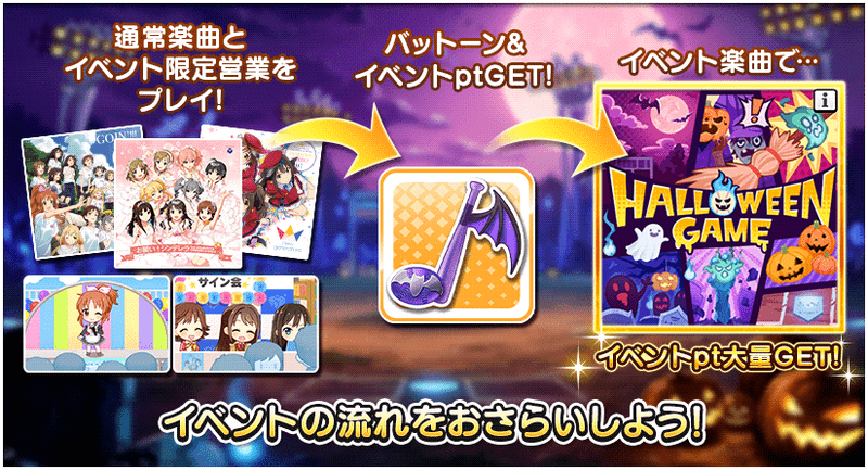 通常楽曲とイベント限定営業でバットーンを集め、イベント楽曲で大量にptを獲得しましょう。