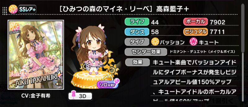 | キュート楽曲でパッションとキュートのアイドルのみ編成時、13秒毎、高確率でかなりの間、パッションアイドルのスコアアップ効果と、キュートアイドルのCOMBOボーナス効果をそれぞれの人数に応じてアップ | |