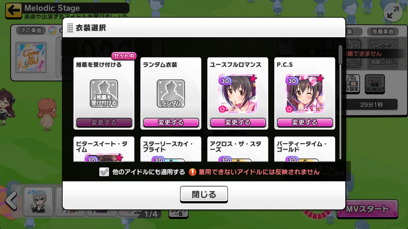 - 楽曲に合わせて推薦アイドル・推薦衣装を替える人がいます。気を遣ってあげましょう。