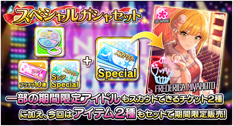 ※各「メモリアルガシャ」はそれぞれ登場アイドルが異なります。詳細はそれぞれのガシャページ内「アイドル詳細」をご確認ください。 - 「スペシャルスカウトチケット」、「スペシャルSレアスカウトチケット」を「スペシャルガシャセット」を購入してから7日後の23:59まで未使用だった場合、ガシャ機能に制限がかかります。