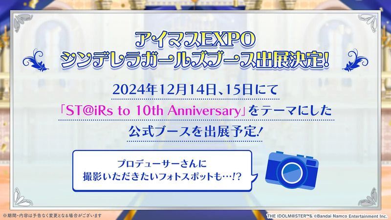 本ブースでは、プロデューサーさんにぜひ撮影いただきたいフォトスポットはもちろん、グッズやST@iRs to 10th AnniversaryKVの展示なども予定しています!