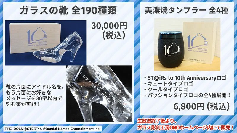 190人のアイドル達を輝かせる「ガラスの靴 全190種」と、「ST@iRs to 10th Anniversaryロゴ」や各タイプロゴをデザインした「美濃焼タンブラー 全4種」をラインナップ!
