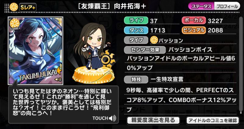| 特攻隊長向井拓海の晴れ姿、目に焼き付けやがれ!瞬き禁止だぜ! | 親愛度MAX | |