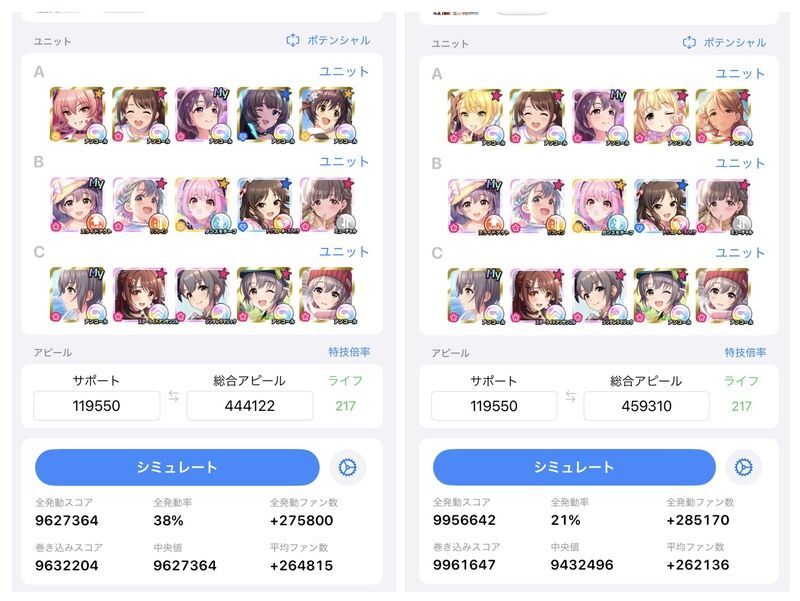 AとCにプリンセスつけてやるとほぼ1000万スコア(右画像、左はAにCoクロスつけたもの)ってそりゃ魔境にもなるわ(卯月など)と思った